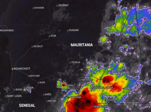 كما تكونت سحب أخرى أكثر كثافة وانتشارا على جنوب الحوض الغربي وقد وصلت الآن، الساعة 22:30، جنوب العصابة وكلها تتحرك غربا أو نحو الجنوب الغربي نحو تكانت، العصابة، كيدى ماغا والبراكنة وكوركل، حيث يتوقع أن يشهد جل التراب الوطني تساقطات مطرية من خفيفة إلى غزيرة ابتداء من اليوم وحتى الخميس بإذن الله تعالى، على أن تكون أكثر كثافة على تكانت، الحوض الغربي، كيدي ماغا، كوركل، وآدرار وخاصة يومي الثلاثاء والأربعاء بإذن الله تعالى