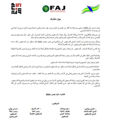 جاء ذلك في بيان مشترك لرابطة الصحفيين الموريتانيين والاتحاد الدولي للصحفيين واتحاد الصحفيين الأفارقة.