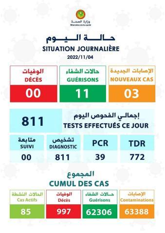 أعلنت وزارة الصحة تسجيل 03 إصلبات جديدة بفيروس كورونا و11 حالة شفاء دون تسجيل أي حالة وفاة مرتبطة بالفيروس خلال 24 ساعة الماضية.