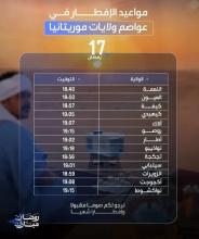 تتراوح أوقات الإفطار اليوم السبت الـ17من أيام شهر رمضان المبارك 1447 هجرية، في عواصم الولايات الموريتانية ما بين 18:40 دقيقة في مدينة النعمة عاصمة ولاية الحوض الشرقي، و19:18 دقيقة في مد