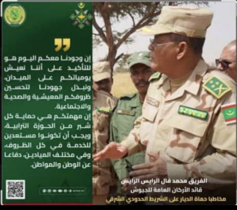 هذه الكلمة تعكس إدراك الفريق محمد فال ولد الرايس لواقع الجندية في الميدان، وتبرز حرصه على أن يكون قريبًا من هموم المرابطين على الثغور، مقدّرًا لتضحياتهم، وساعيا لتحسين أوضاعهم من مختلف الجوانب، في تأكيد واضح على أن القيادة ليست منصبًا مكتبيًا فقط، بل التزام يومي ومشاركة حقيقية في صلب التحديات.