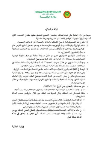 وقالت الوزارة إنها قررت "تنفيذ القانون وضمان الشفافية والمنافسة وتساوي الفرص، وتصحيح هذه الوضعية من خلال إجراءات من بينها دفع مستحقات المعنيين حتى تاريخ 2025/12/31، وعدم تجديد هذه العقود إلا بعد التزام القطاعات المعنية بالإجراءات القانونية.