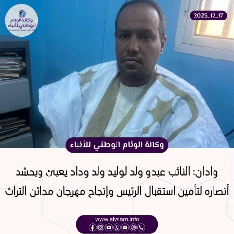 في مشهدٍ يعكس عمق الانتماء الوطني وصلابة الرصيد الشعبي، برز النائب عبدو ولد لوليد ولد وداد، نائب مقاطعة وادان، بوصفه مهندس التعبئة الميدانية وقائد الحشد المنظم، وهو يشرف بحنكةٍ واقتدار على تأمين استقبالٍ حاشدٍ لفخامة رئيس الجمهورية السيد محمد ولد الشيخ الغزواني، وإنجاح مهرجان مدائن التراث الذي يشرف الرئيس على افتتاحه.