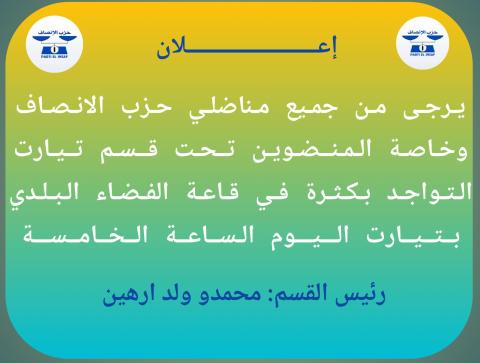 دعا رئيس قسم تيارت، محمد ولد ارهين، كافة مناضلي ومناضلات حزب الإنصاف إلى الحضور بكثافة والمشاركة الفاعلة في حملة شرح مخرجات المؤتمر التي أطلقها الحزب، والمقررة على مدى ثلاثة أيام، والمتوزعة على ولايات نواكشوط الثلاث.