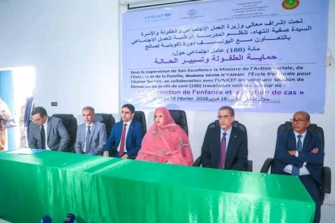 أشرفت وزيرة العمل الاجتماعي والطفولة والأسرة، صفية انتهاه، اليوم الخميس، رفقة وزير تمكين الشباب والرياضة والخدمة المدنية محمد عبد الله ولد لولي، ووالي نواكشوط الغربية حمود ولد امحمد، على افتتاح دورة تكوينية بالمدرسة الوطنية للعمل الاجتماعي في نواكشوط، موجهة لصالح 100 عامل اجتماعي حول حماية الطفولة وتسيير الحالة.