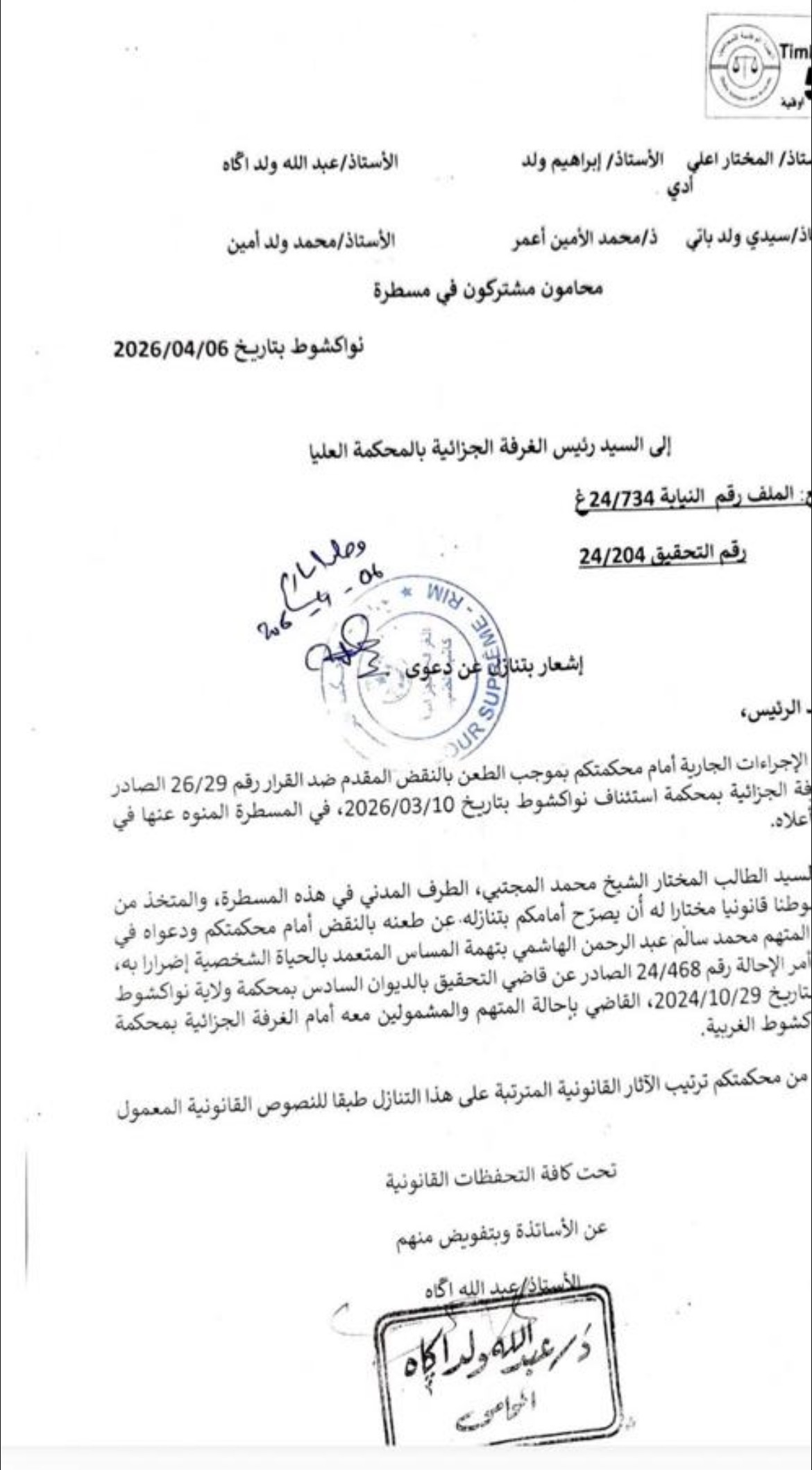 أصدر فريق دفاع النائب السابق محمد سالم أبو عبد الرحمن الهاشمي بيانا أوضح فيه موقف موكله من إشعار بتنازل عن دعوى، تقدم به دفاع السيد الطالب المختار الشيخ المجتبى، وأودِع لدى كتابة ضبط الغرفة الجزائية بالمحكمة العليا.