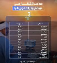 تتراوح أوقات الإفطار اليوم السبت ثالث أيام شهر رمضان المبارك 1447 هجرية، في عواصم الولايات الموريتانية ما بين 18:36 دقيقة في مدينة النعمة عاصمة ولاية الحوض الشرقي، و19:12 دقيقة في مدينة