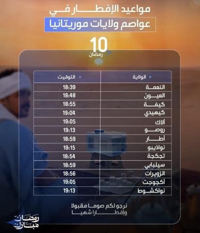 أوقات إفطار السبت عاشر أيام رمضان في عموم موريتانيا