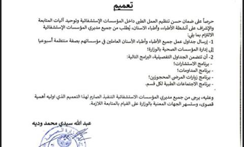 أصدر وزير الصحة عبد الله سيدي محمد وديه تعميما لتنظيم عمل الأطباء وأطباء الأسنان، وذلك عبر إرسال جداول عملهم في مؤسساتهم بصفة منتظمة أسبوعيا إلى إدارة المؤسسات الصحية بالوزارة.