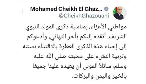 هنأ فخامة رئيس الجمهورية، السيد محمد ولد الشيخ الغزواني، مواطنيه بمناسبة حلول ذكرى المولد النبوي الشريف، وحثهم على الاقتداء بسنة المصطفى وتربية الناشئة على محبته صلى الله عليه وسلم.