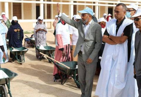 أشرف معالي المندوب العام للتضامن الوطني ومكافحة الاقصاء السيد الشيخ ولد بد صباح اليوم الأحد من مدرسة خديجة بنت خويلد في مقاطعة دار النعيم بولاية نواكشوط الشمالية على إطلاق حملة وطنية تطوعية لتنظيف المدارس الابتدائية والثانوية في عموم التراب الوطني قبل بداية العام الدراسي2025-2026.