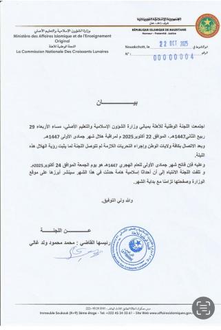 وأكدت اللجنة أن فاتح شهر جمادي الأولى سيكون يوم الجمعة الموافق ال23 أكتوبر الجاري.