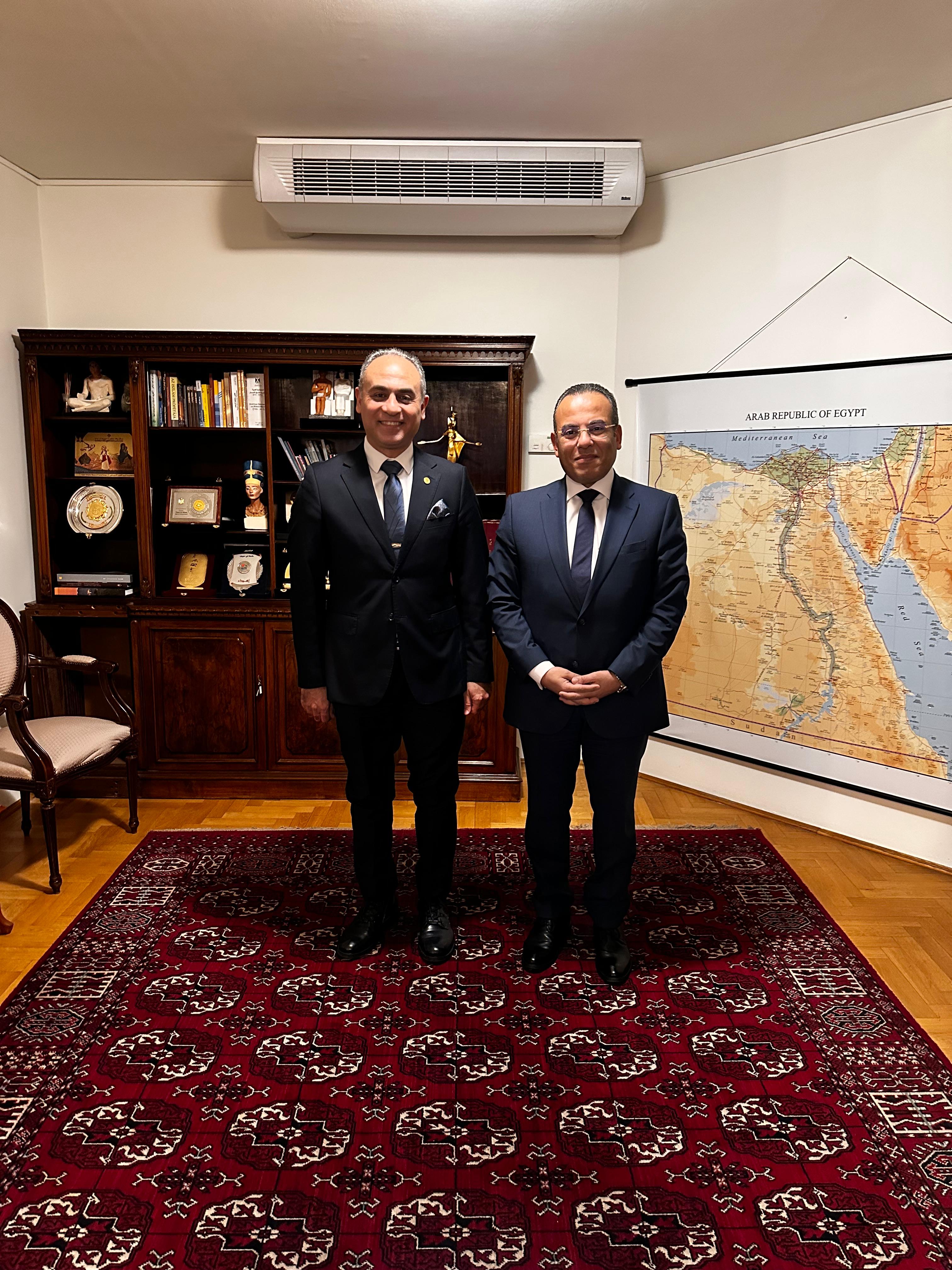 من جانبه، أعرب بهجت العبيدي عن بالغ شكره وتقديره للسفير على حسن الاستقبال وعمق الحوار، مؤكدًا أن اللقاء يعكس وعي الدولة المصرية بأهمية القوة الناعمة والفكر المستنير، وقال: نحن في مؤسسة رسالة السلام العالمية نؤمن أن حماية الأوطان تبدأ بحماية الوعي. والتعاون مع السفارات المصرية في الخارج يمثل ركيزة أساسية لنشر خطاب ديني إنساني، يعيد الاعتبار للعقل، ويقطع الطريق على من يتاجرون بالدين ويشوّهون صورته لتحقيق مصالح سياسية أو أيديولوجية.