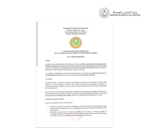 أعلنت وزارة المعادن والصناعة الموريتانية عبر المديرية العامة للصناعة عن إطلاق دعوة دولية لإبداء الاهتمام (AMI) رقم 0001/DGI/MMI/2026، وذلك في إطار التحضير لإنشاء منطقة صناعية استراتيجية بمنطقة العرية في ولاية الترارزة.